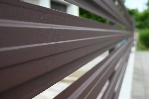 Modern, esztétikus, letisztult megjelenésű íves acél kerítéslécek.
